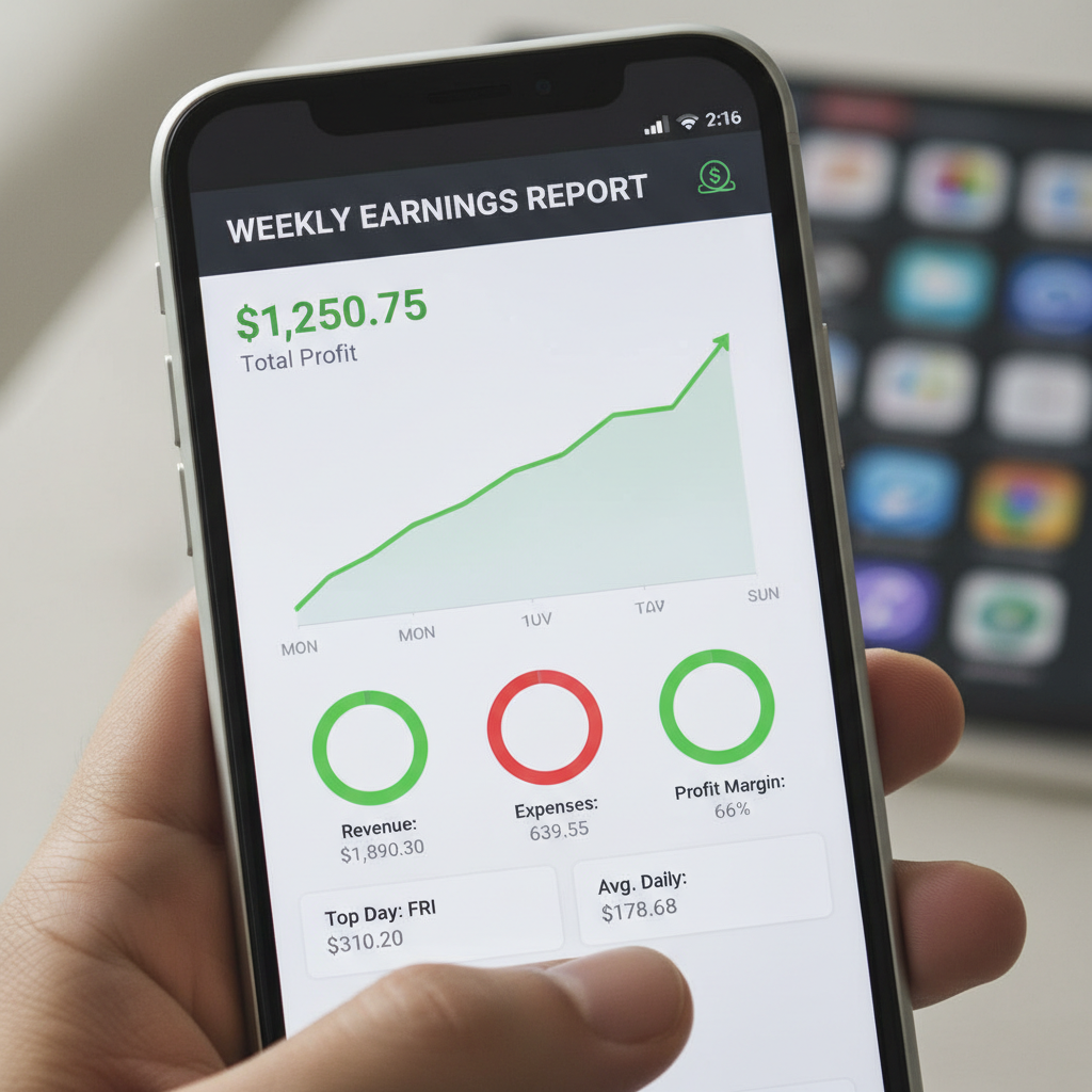 Mobile notification showing weekly earnings report with profit graphs and statistics